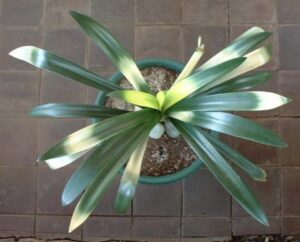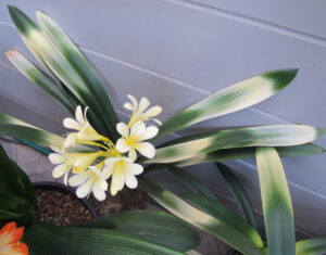 Description: a variegated form of Clivia with cross banded areas of creamy yellow. Flowers may be any colour. See Light of Buddha.