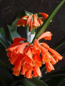 Description: a Lotter C. miniata x C. robusta hybrid with dark orange, well curved flowers that flare at the mouth. A strong grower and one of the newer releases. Flowerhead dia 17cm on a 105cm high peduncle. Leaves are 65mm wide.