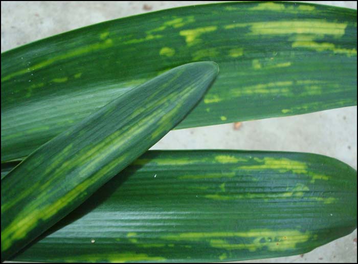 Description: A viral mottled variegated form of Clivia miniata grown in Japan. Has normal orange flowers. Also called “Tiger” in Japan and can be confusing as there is a banded leaf mutation called ‘Tiger’. See ‘Tiger’