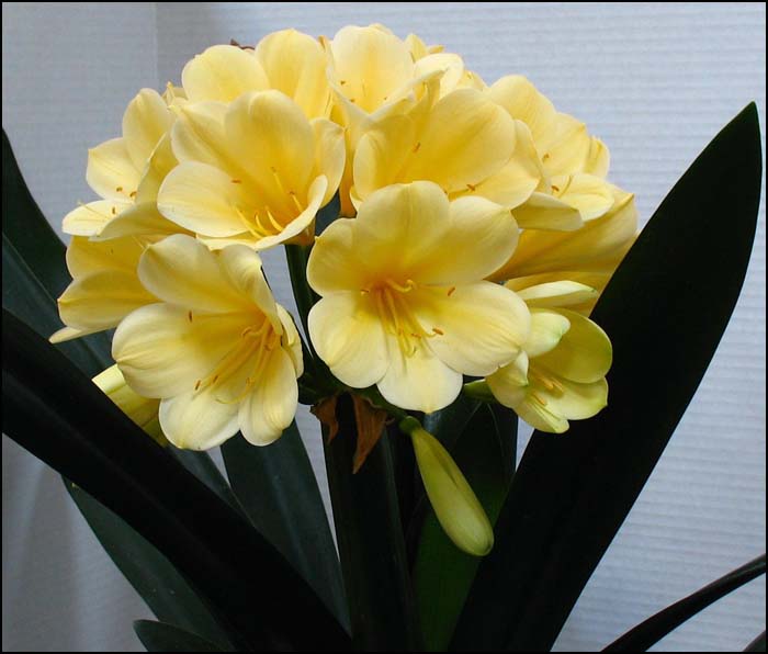Description: This is the first cultivar released from the Longwood Gardens breeding program. The berry parent – seedling no. 89xv1-13 and the pollen parent – seedling no. 89xv1-11 resulted from a 1989 cross of Clivia miniata citrina – Longwood Gardens accession no. 1981-0239 and Longwood Gardens accession no. 1974-0850. The cross was made in 1993 by Dr. Robert Armstrong, Research Horticulturist at Longwood Gardens. Breeder’s number 93xV7-5. Selection made in 1999. Longwood Gardens accession number 1999-0264. Nomenclatural standard deposited in KEN. The public release was at the March, 2011 conference of the NACS held at Longwood Gardens. Plant medium to large. Leaves 45 to 65cm long and 45 to 65mm wide, dull, dark green (RHD fan 3, Green Group 136B, Clivia Colour Chart II Swatch10/91). Scapes 37 to 56cm long. Umbels 21 to 26cm wide, with 10 to 24 flowers. Flowers 7 to 9cm wide, and 7 to 9cm long, flared to nearly open with tepals diverging at about 45o. Pedicels 3 to 6cm long. Tepals overlapping from the base, obovate, slightly revolute, with rounded tips and entire margins. Inner tepals 35 to 45mm wide. Outer tepals 28 to 30mm wide. Inner and outer surface of tepals yellow. Inner surface transitions from RHS Fan 1 Yellow Group 3C (Clivia Colour Chart II Swatch 9/88) along the midrib to Yellow Group 1D (Clivia Colour Chart II Swatch 9/83) along the margin. Outer surface transitions from RHS Fan 1 Yellow Group 8B (Clivia Colour Chart II Swatch 9/87) along the midrib to Yellow group 8C (Clivia Colour Chart II Swatch 9/83) along the margin. The large, slightly fragrant yellow flowers with wide overlapping tepals are held in large umbels on sturdy scapes..
