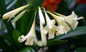 Description: Registered Cultivar: This is an interspecific hybrid grown and named by David Olsen. The seed was purchased from Gideon Botha. It is named for the lily like flower form and the pale creamy-white bloom, which opens white and darkens to a creamy yellow as the flower matures. Each bloom is an elongated form with recurved petal tips. The pendulous flower becomes more upright as it ages.