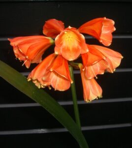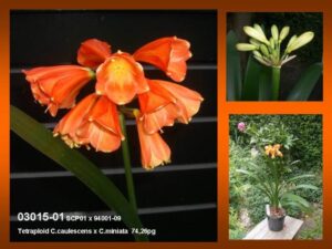 Description: This first known tetraploid interspecific Clivia is a cross between a diploid C. caulescens motherplant-SCP01 and a tetraploid C. miniata-94001-09. The plant is a tetraploid (2n= 4c= 74,26 pg) so the motherplant must have produced an unreduced gamete (egg cell). ‘4Tissimo’ is fertile on both male and female side. Can produce seeds with a normal diploid clivia. Flowersize 5.7cm long and 3.3cm width. Colour is between OR5 and OR6 depending on light levels. The 4 refers to the tetraploid nature and fortissimo means loud, like the DNA level.